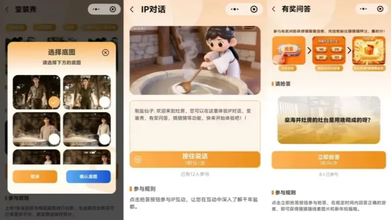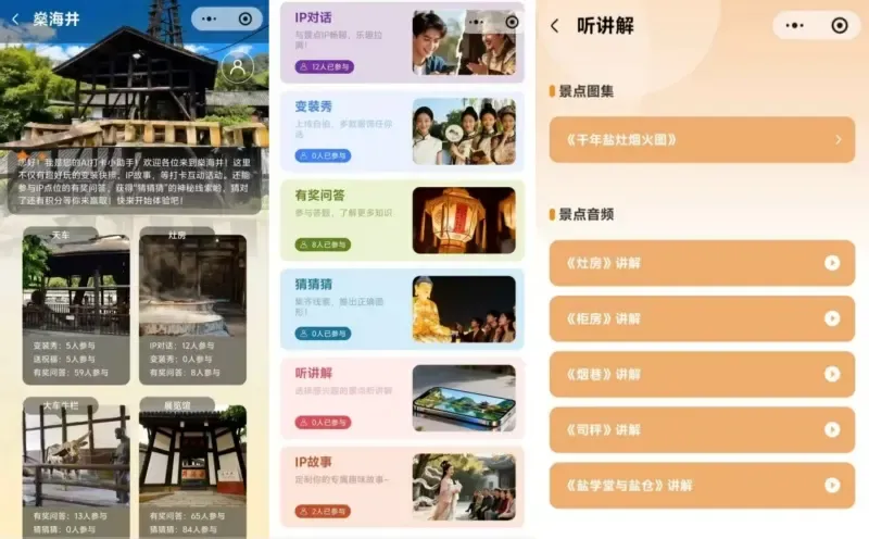 功能介绍:燊海井景点共设置4个打卡点位进行线上互动,功能包含:有奖竞猜、猜图形、听讲解、听故事、变装秀、送祝福、AI对话