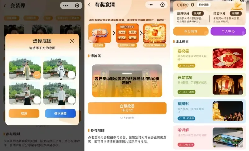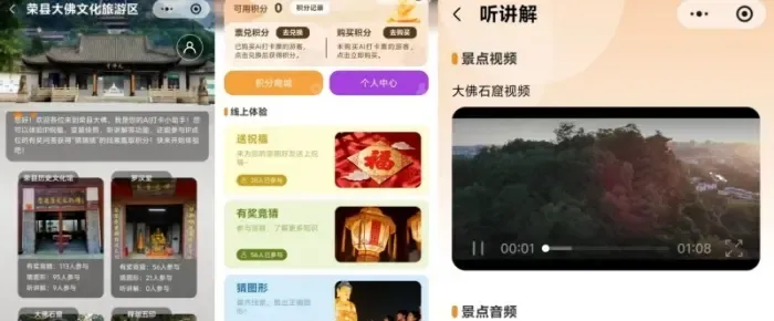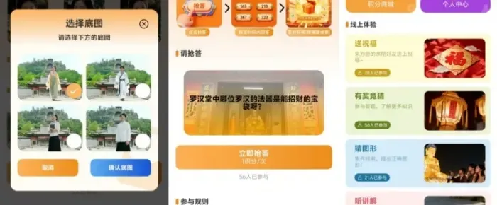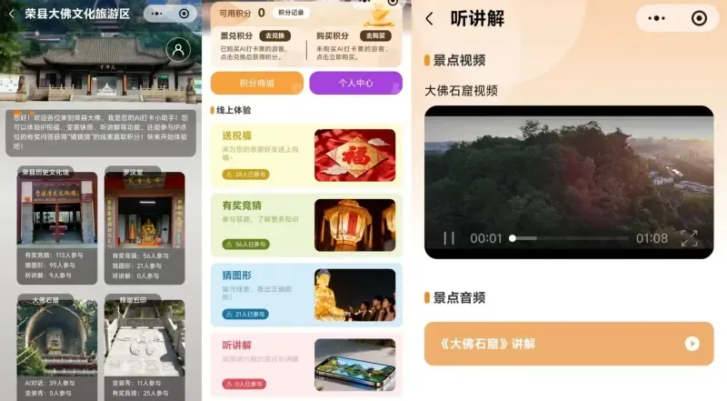 1、功能介绍:荣县大佛景区共有4个打卡点进行线上互动,功能包含:有奖竞猜、猜图形、听讲解、听故事、变装秀、送祝福、AI对话